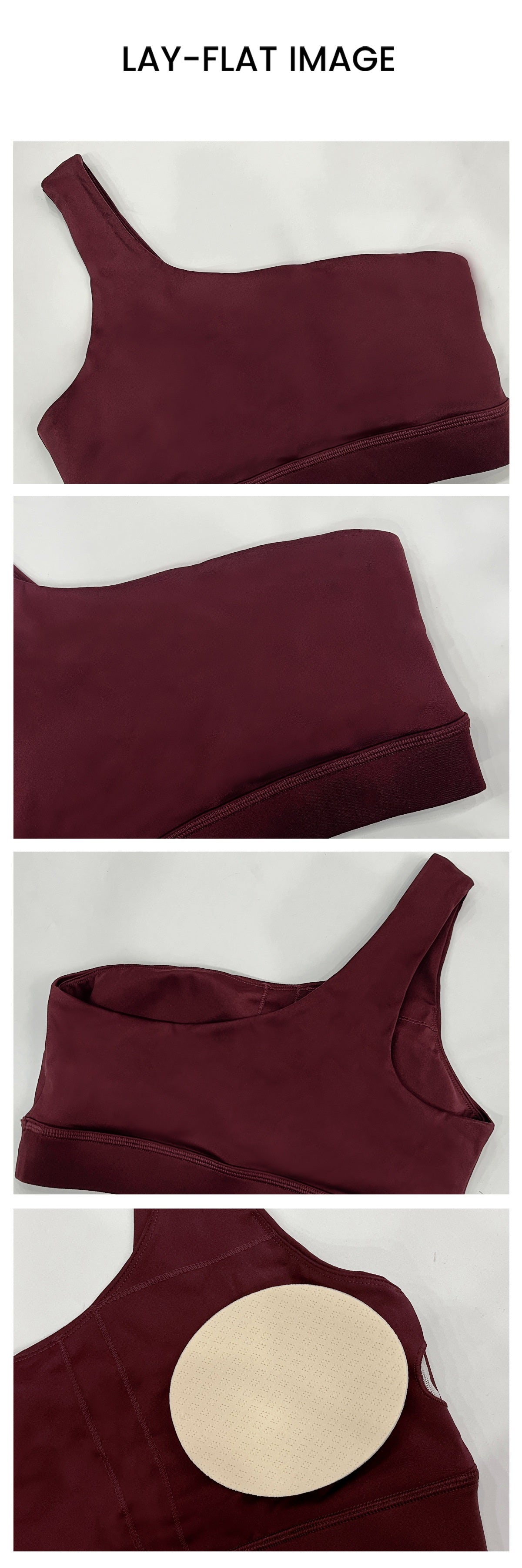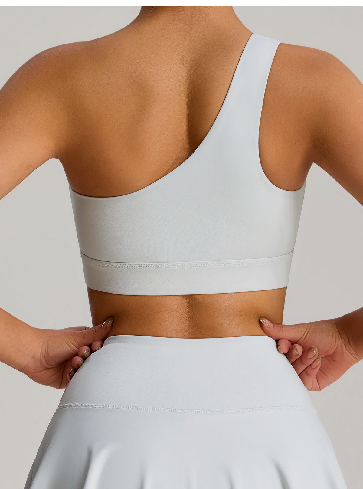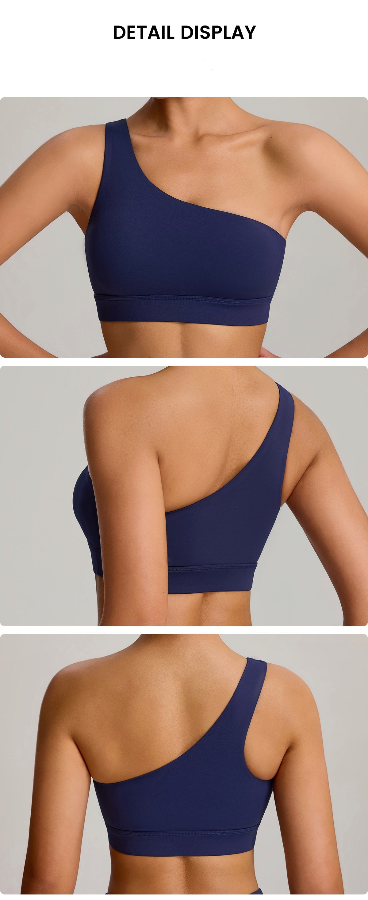 Breaking away from the monotonous design of traditional sports bras, this innovative asymmetrical one-shoulder design features a simple shoulder strap on one side for stable support, while the other side's flowing off-shoulder design accentuates the shoulder line, softening the appearance of broad shoulders and highlighting the beautiful contours of the neck and collarbone, creating a stylish and distinctive look. Paired with a sophisticated and sexy back design, the smooth and clean lines of the back allow for a light and graceful physique during exercise. Whether you're at the gym, practicing yoga, or jogging outdoors, this bra will make you the center of attention, combining functionality and style in your workout attire.
