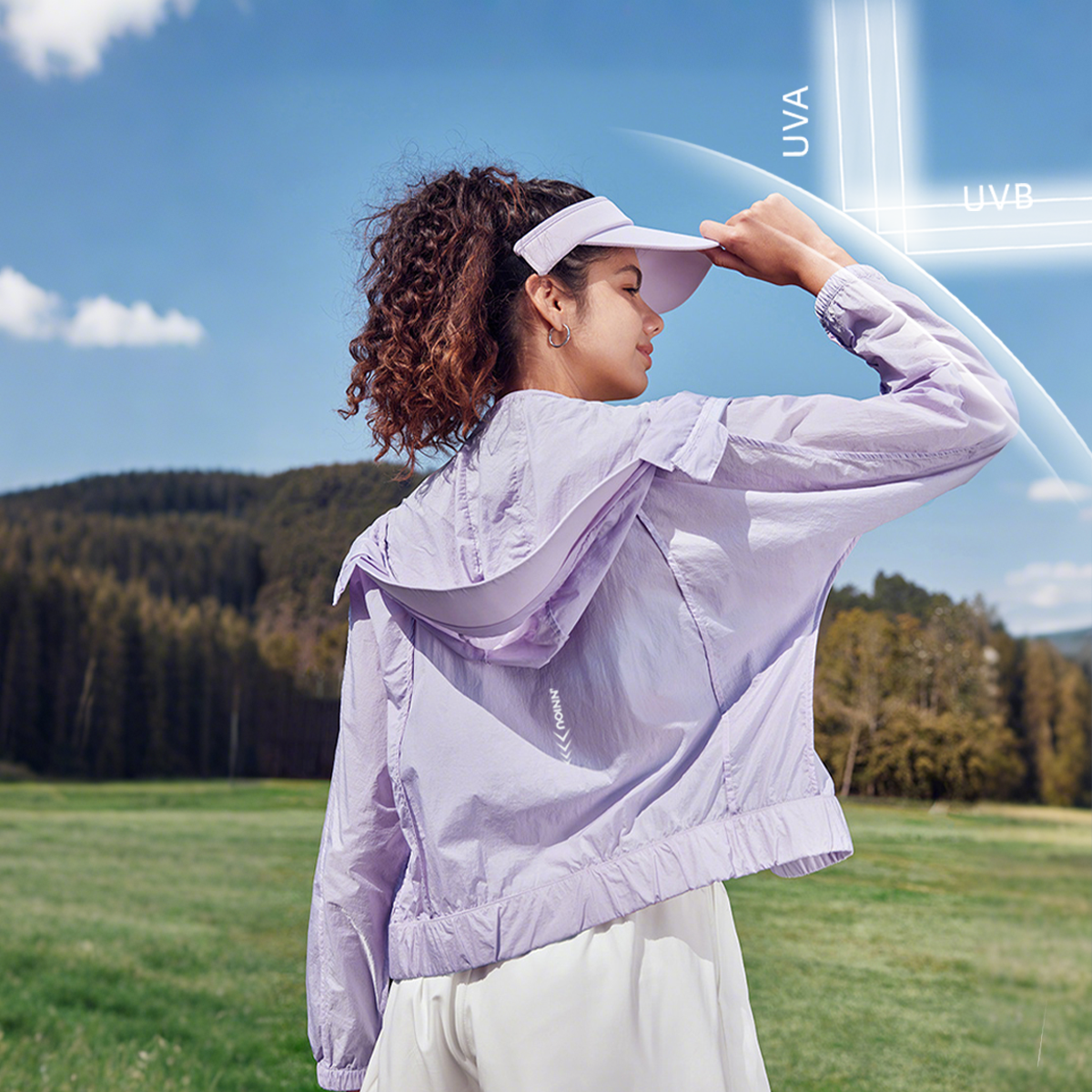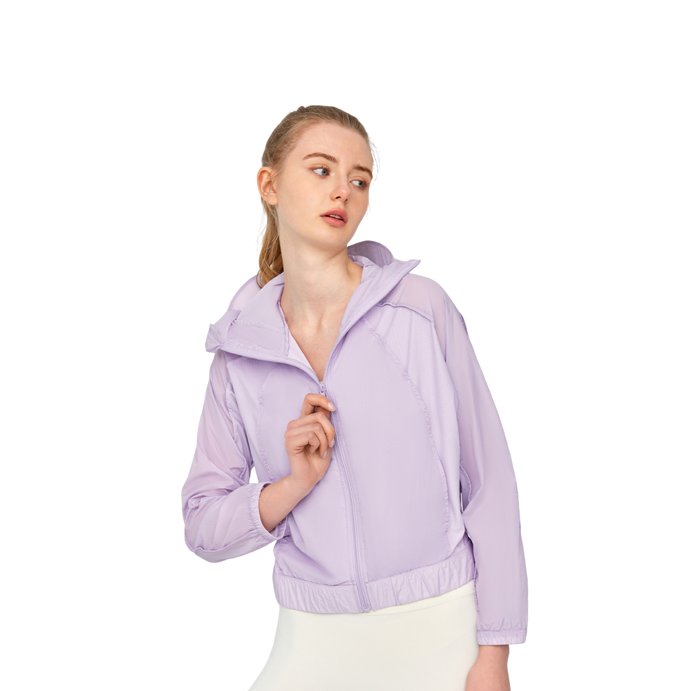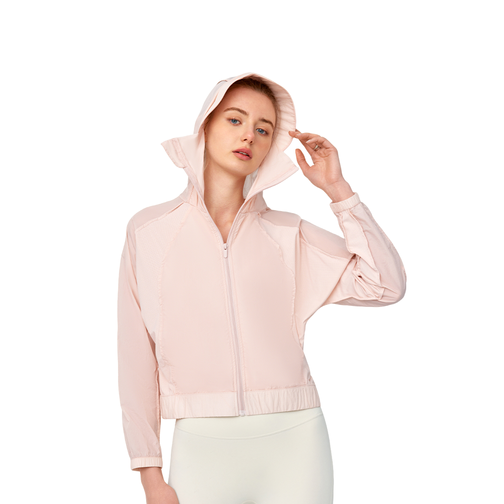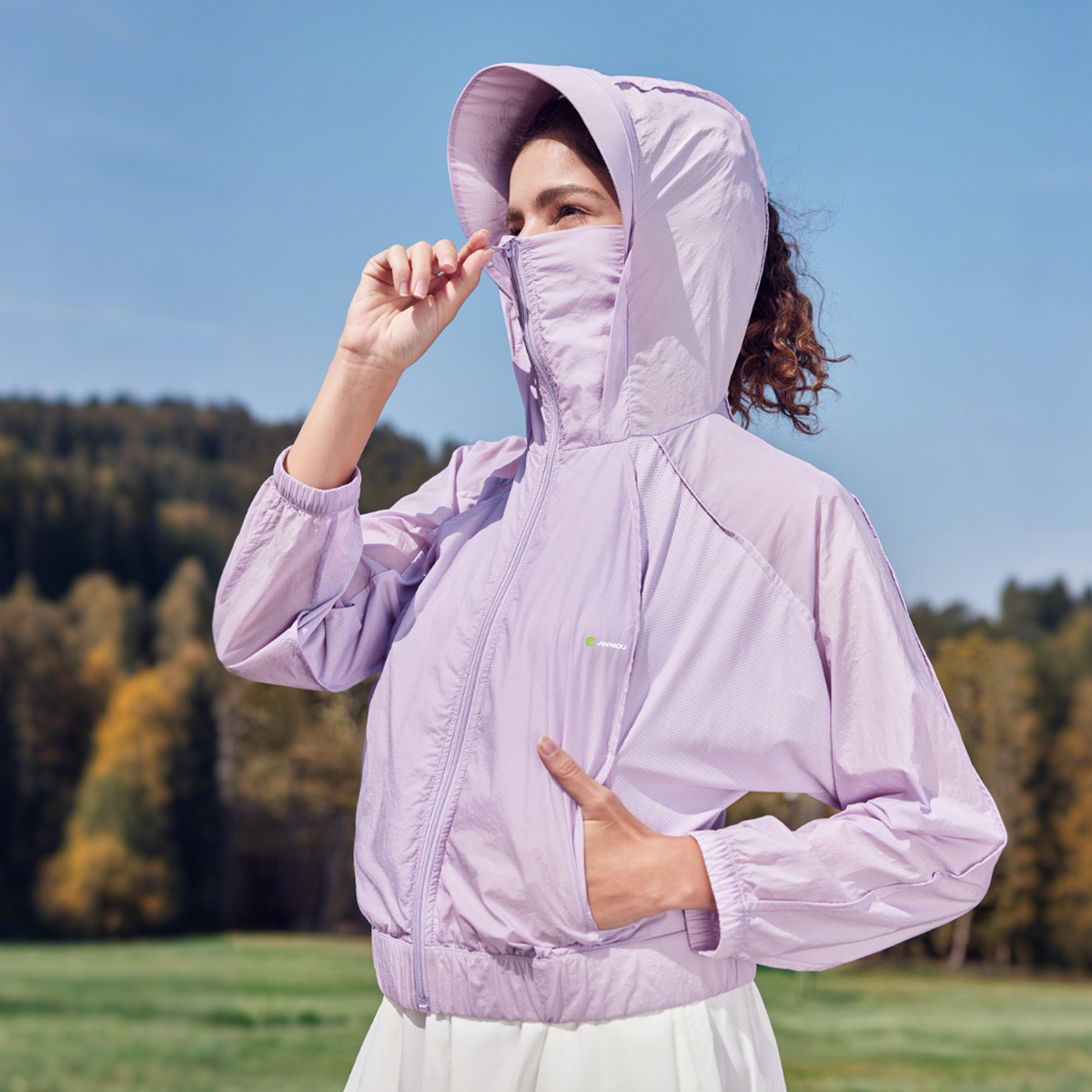 The thoughtful design includes mesh panels at the front and back shoulders to increase ventilation, a widened hood that integrates head, neck, and face coverage for full 360° protection, and elastic cuffs and hem for a secure fit without restricting movement. Reflective details on the back and hem enhance safety for evening workouts, while the ponytail hole at the back of the hood keeps hair comfortably out of the way. The fully bound inner seams increase durability, ensuring this jacket will be your trusted summer companion for years. Available in four stylish colors—almond, black, light purple, and light pink—and sizes S through XL.