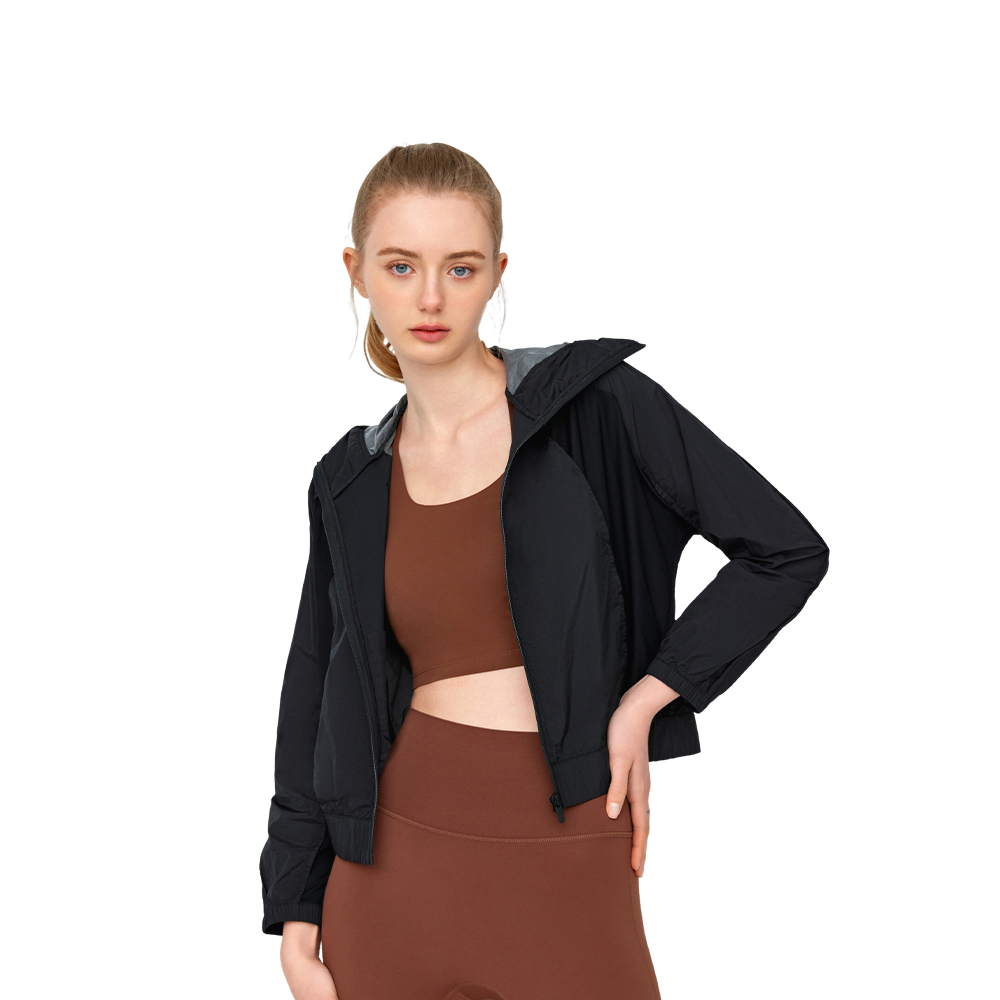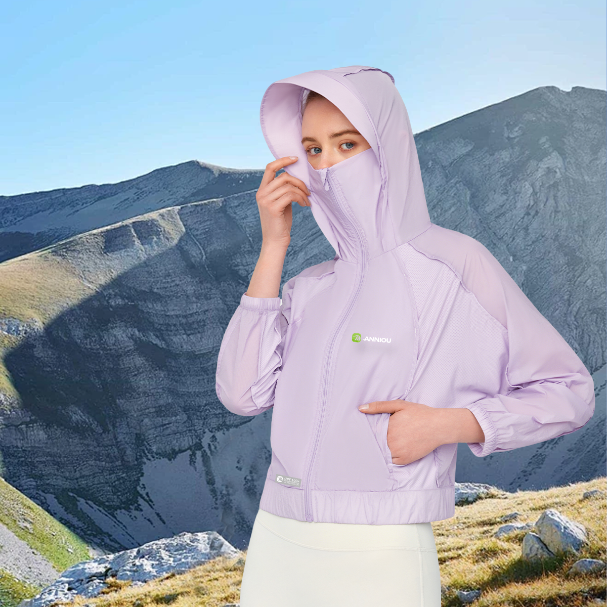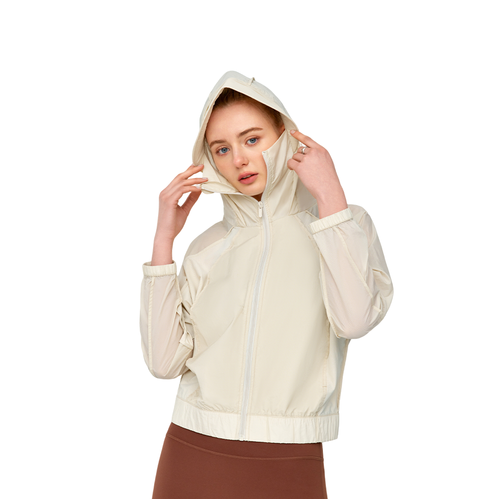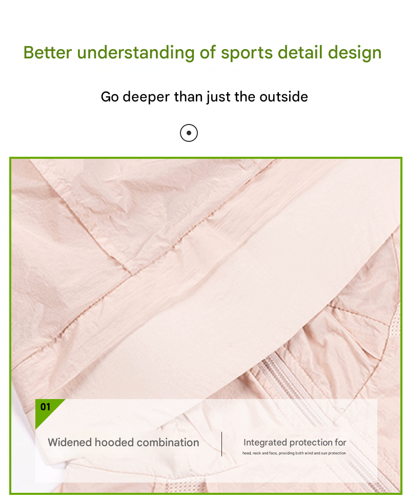 The thoughtful design includes mesh panels at the front and back shoulders to increase ventilation, a widened hood that integrates head, neck, and face coverage for full 360° protection, and elastic cuffs and hem for a secure fit without restricting movement. Reflective details on the back and hem enhance safety for evening workouts, while the ponytail hole at the back of the hood keeps hair comfortably out of the way. The fully bound inner seams increase durability, ensuring this jacket will be your trusted summer companion for years. Available in four stylish colors—almond, black, light purple, and light pink—and sizes S through XL.