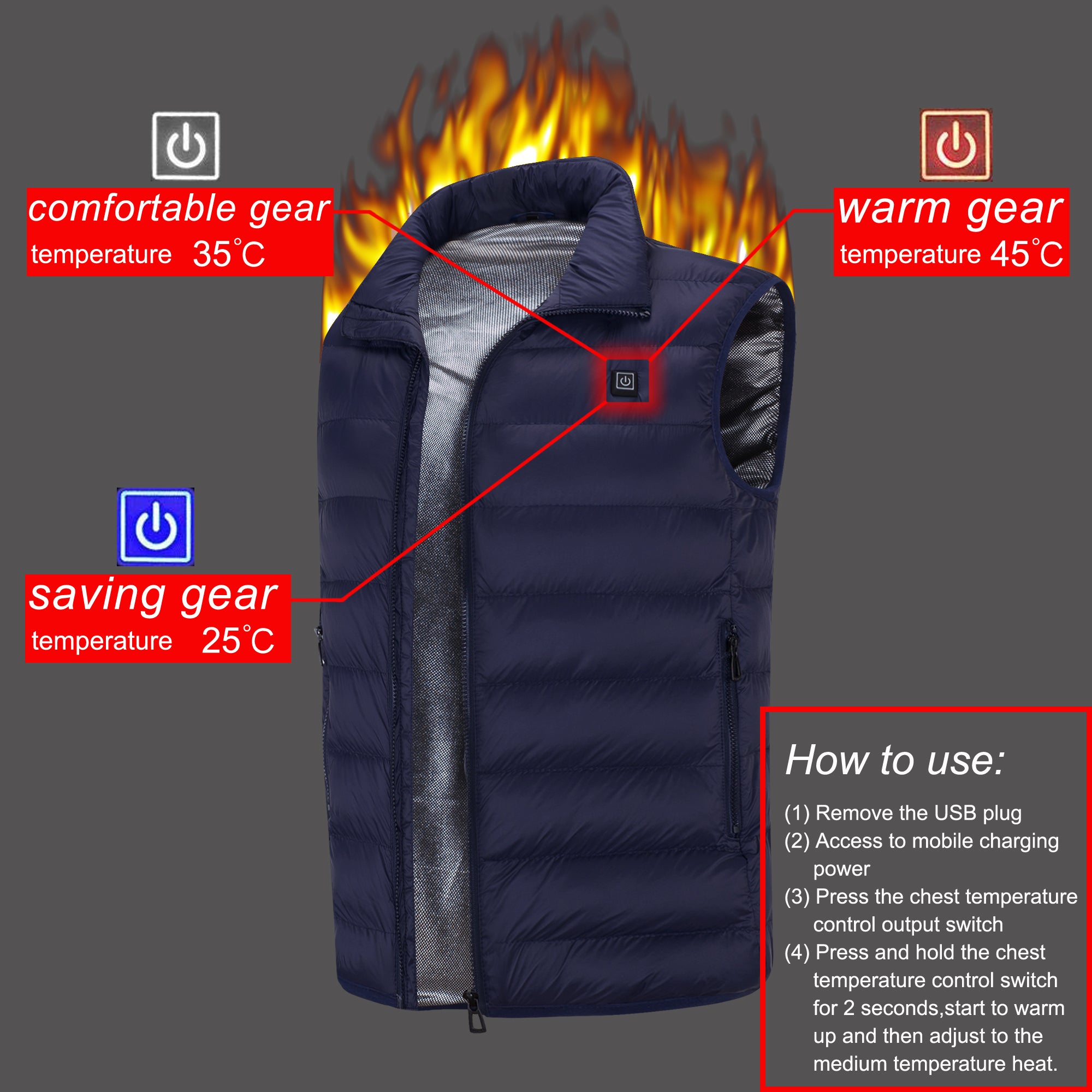 In cold seasons, people's pursuit of warmth never ceases. The Navy 3 Area One-Button Heated Gilet is an innovative garment born to meet people's dual needs for warmth and comfort in low-temperature environments. It breaks through the limitation of traditional thermal vests that only rely on filling materials for passive warmth. By integrating advanced electric heating technology, it brings active, controllable, and long-lasting warm experience to the wearer. Whether you are engaging in outdoor activities such as skiing and hiking, or commuting and working daily, even in a cold indoor environment, this heated vest can be your powerful assistant to resist the cold, allowing you to feel as warm and comfortable as in spring even in cold days.