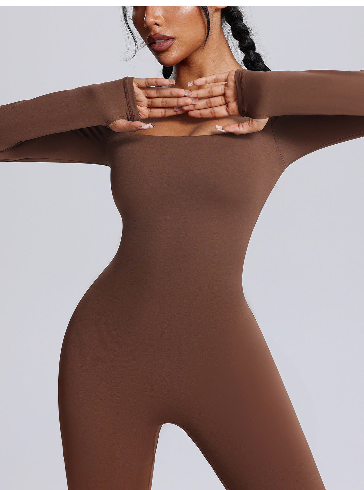 At the core of this jumpsuit is its luxe “barely-there” fabric: a blend of 78% nylon and 22% spandex that’s engineered for both softness and performance. Dubbed “Bare Feel,” this material feels silky-smooth against the skin, like a second layer that’s lightweight yet supportive—perfect for long hours of wear. Its high elasticity ensures a snug, personalized fit that adapts to your body shape without feeling restrictive, while its breathable and moisture-wicking properties keep you cool and dry, even during intense workouts. The design details elevate both function and style: the square neckline adds a touch of elegance while framing the collarbone, the long sleeves feature a convenient thumbhole design to keep them in place (and add a sleek, sporty vibe), and the micro-flared leg silhouette balances the body’s proportions, creating a lengthening effect that flatters every height and build. Every stitch is precision-crafted for durability, with reinforced seams that stand up to repeated stretches and washes—so this jumpsuit stays looking and feeling like new, wear after wear.