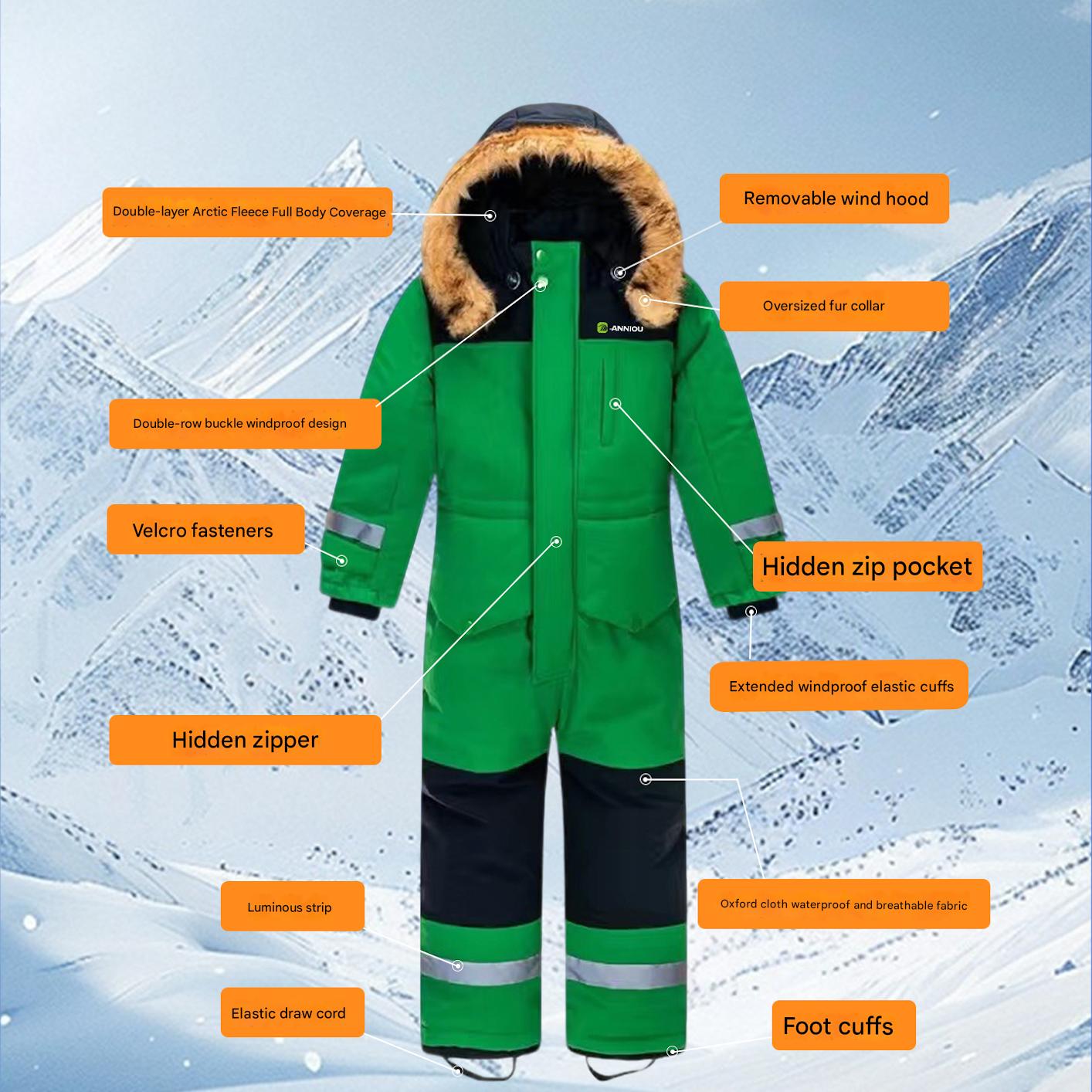 This winter, don't let the cold stop your child from exploring nature. This Winter Children Windproof Ski Jumpsuit combines warmth, windproofing, waterproofing, safety, and practicality, using professional technology to ward off the chill and thoughtful design to alleviate any worries. Choose it, and let your little one run and laugh freely in the snowy world, creating joyful winter memories. Parents can simply relax and enjoy quality time together.