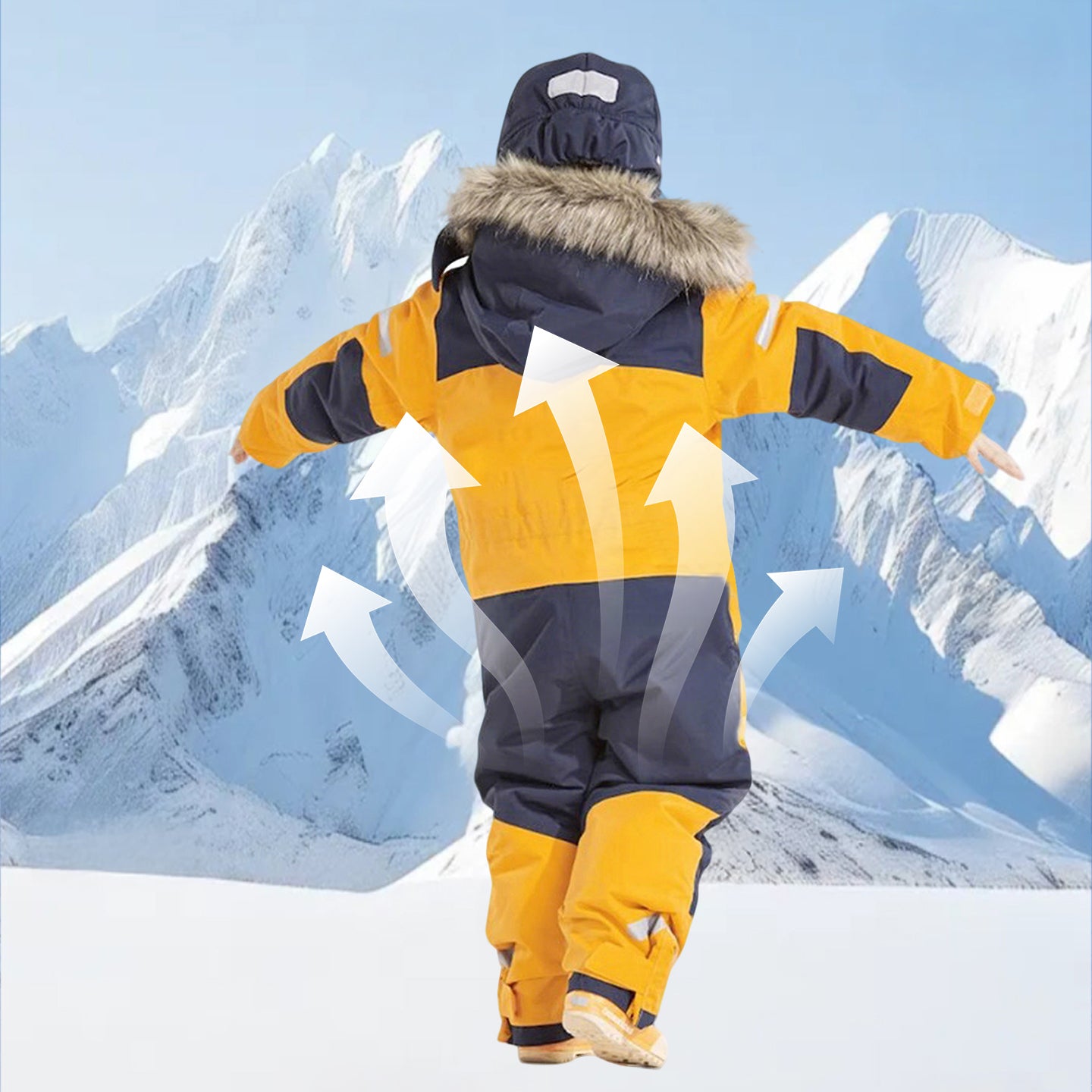 As snow blankets the mountains and fields, children's eyes sparkle with anticipation for the snow and ice, while parents' worries are always tinged with concerns like "Will they get cold?" and "Will they get wet?" This Winter Children Windproof Ski Jumpsuit uses professional technology as its shield and thoughtful design for warmth, providing comprehensive protection from fabric to details, allowing children to play freely even in sub-zero temperatures, giving parents peace of mind.