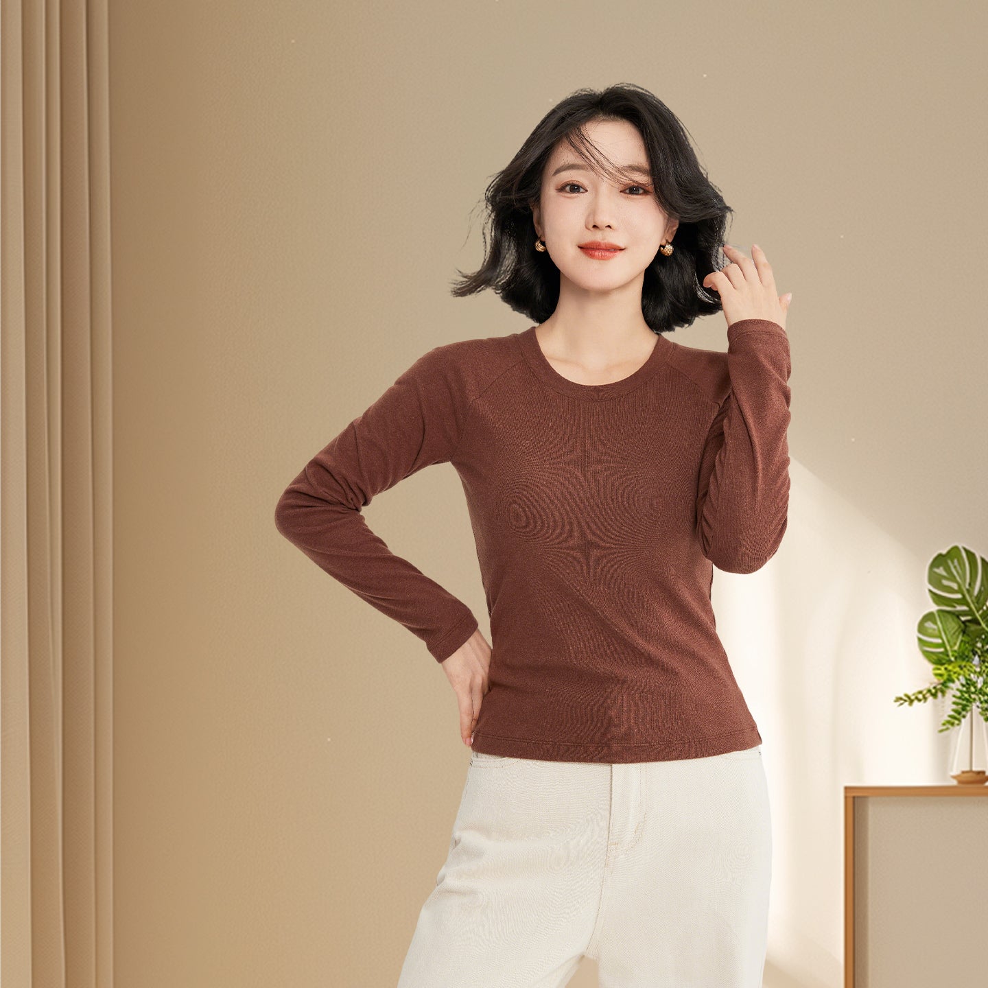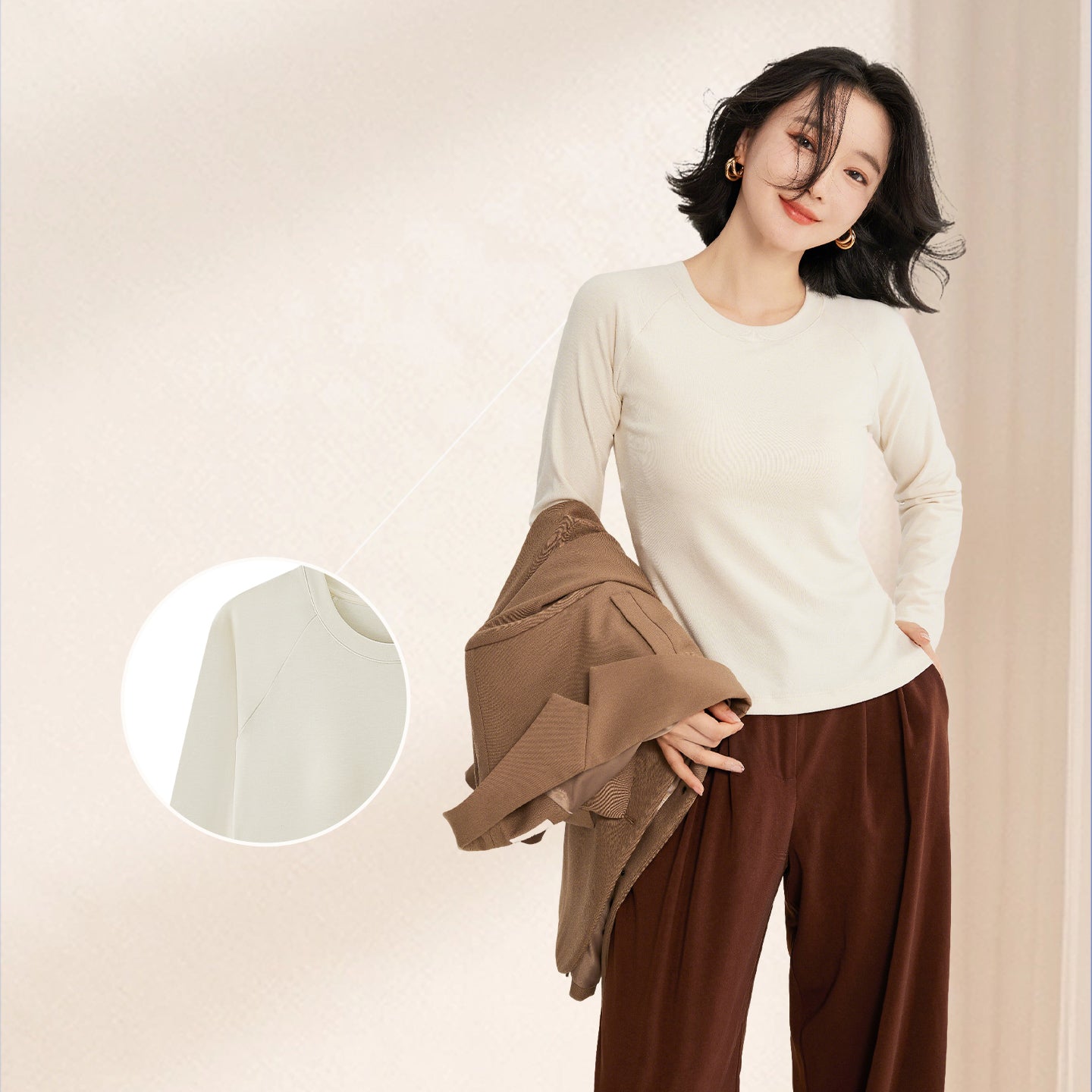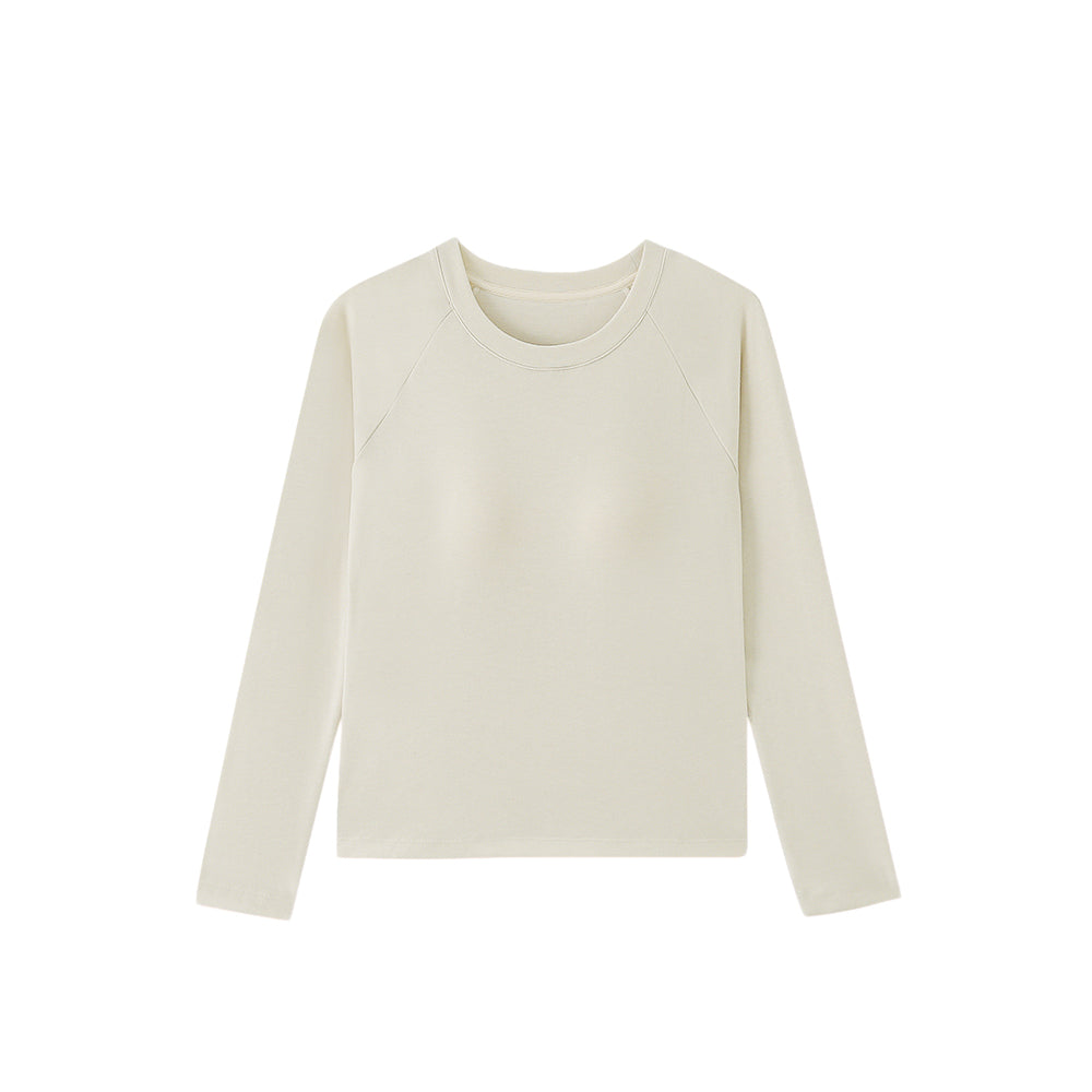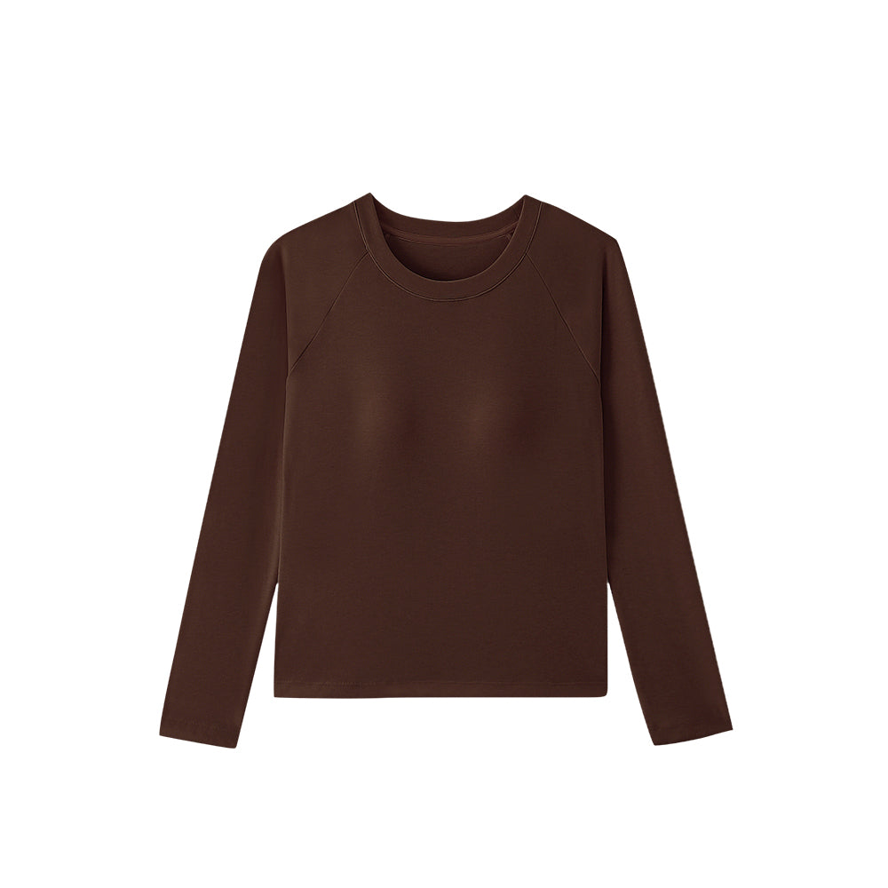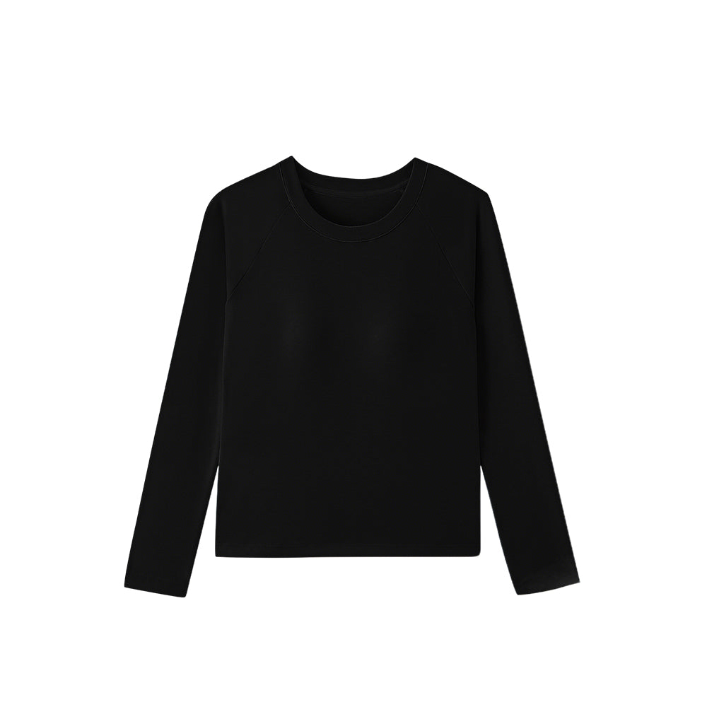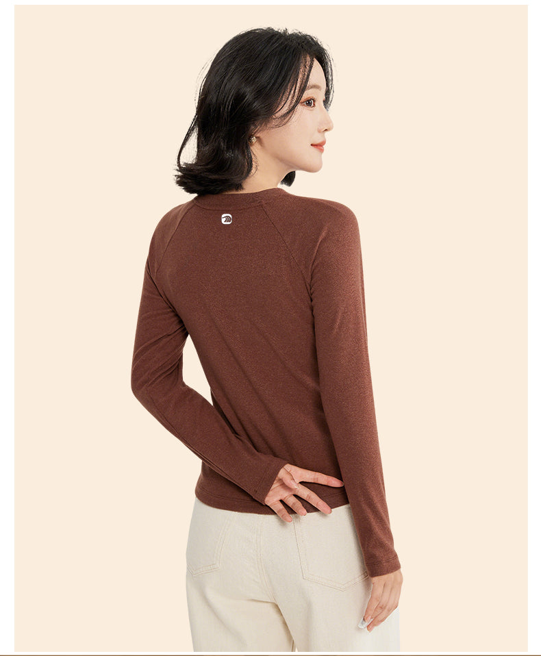 The classic crew neck offers versatility for layering or standalone wear, while raglan sleeves extend from the neckline to the underarm, enhancing mobility and creating a slimming effect on the shoulders and arms. A standout feature, the water-drop shaped latex pad boasts over 1,900 breathable holes, increasing air permeability by 80%. It’s designed to fit various bust shapes, providing support without the need for a separate bra, and its full-surround construction ensures it stays in place—even in the washing machine. The fabric’s double-brushed finish delivers a “bare-skin” softness, making it gentle enough for sensitive skin while adding an extra layer of warmth. Dubbed the “figure-flattering cut,” it contours to the body to accentuate curves while strategically hiding any areas you’d like to minimize, making it a confidence booster for all body types. A subtle yet sophisticated detail on the back, it showcases the brand’s commitment to craftsmanship and adds a touch of luxury.