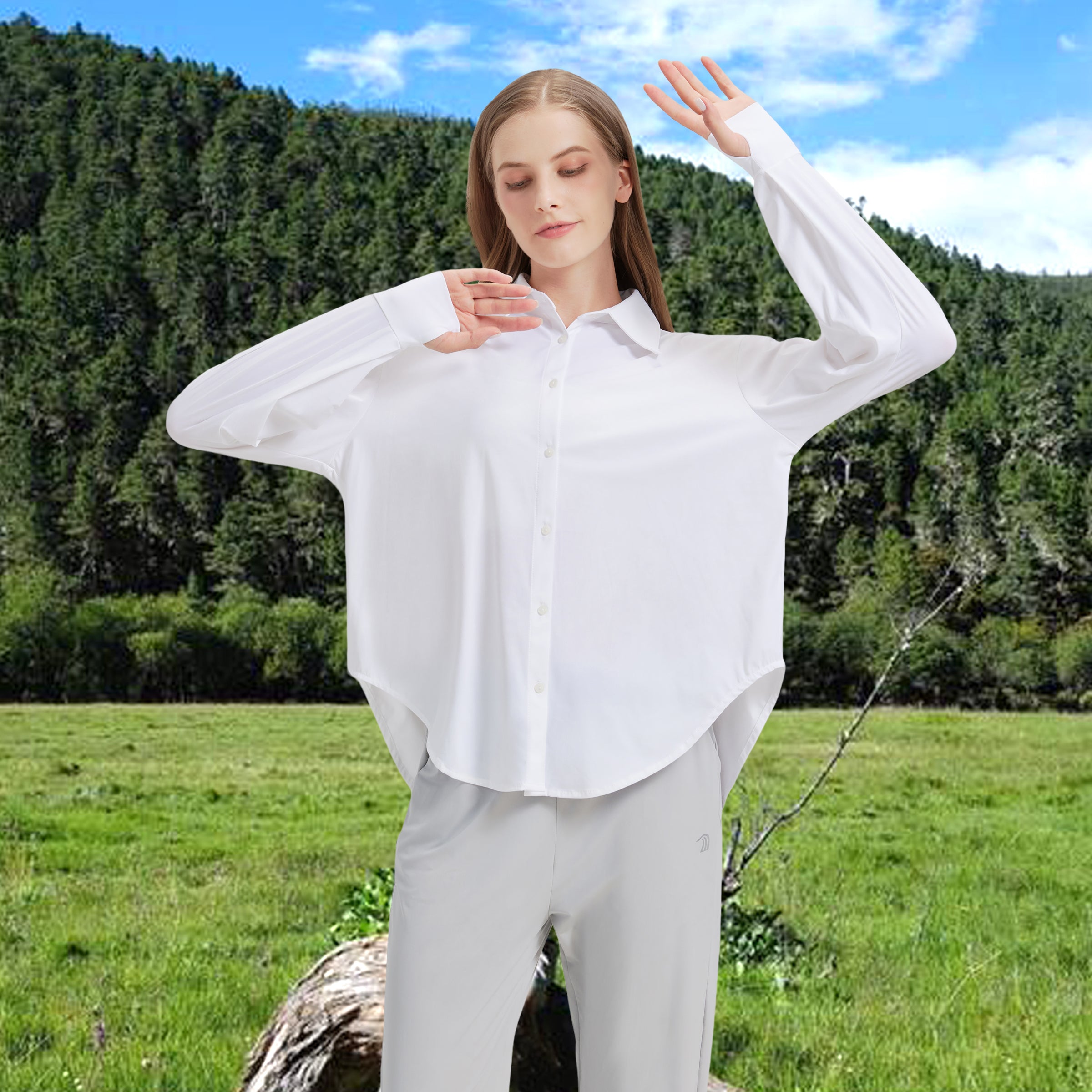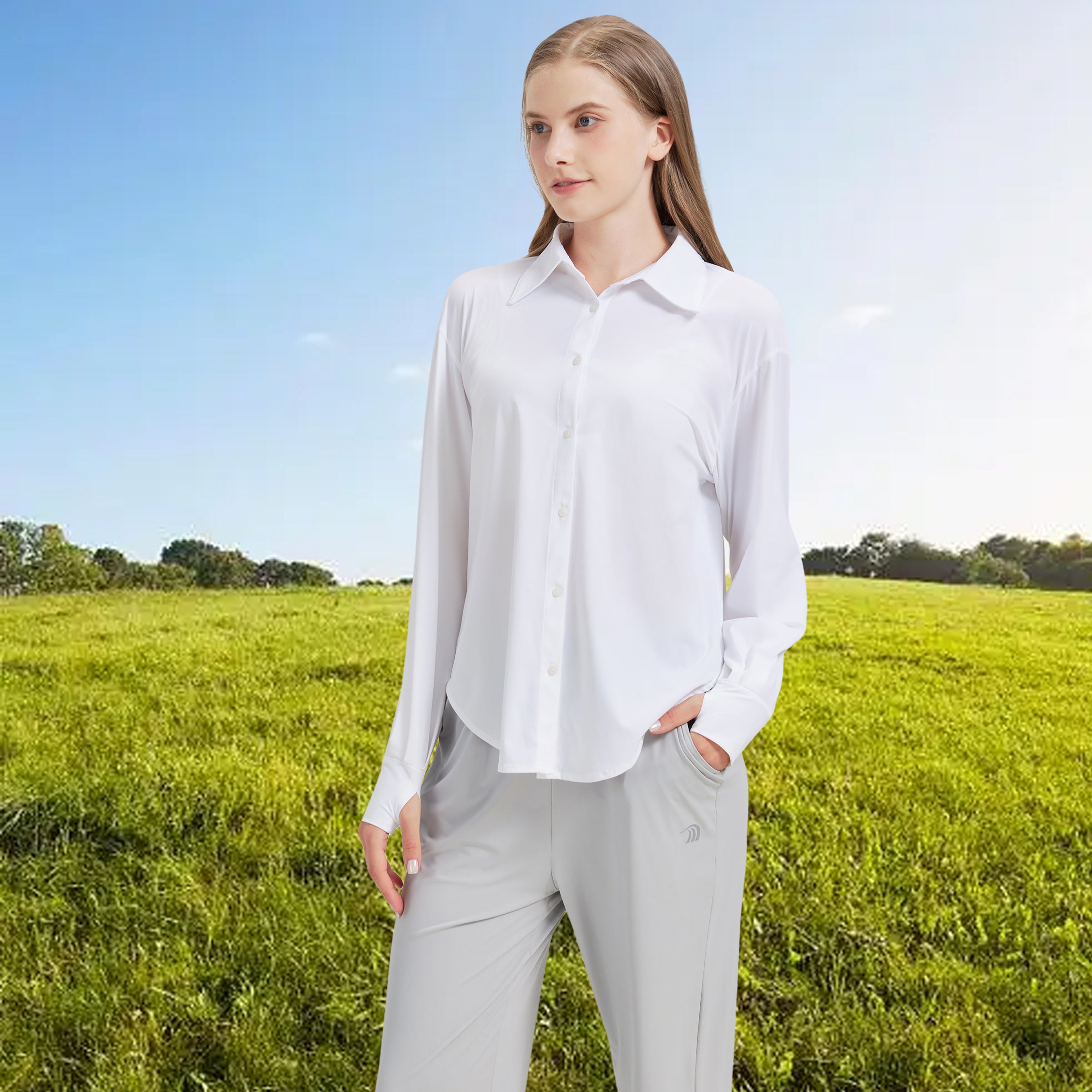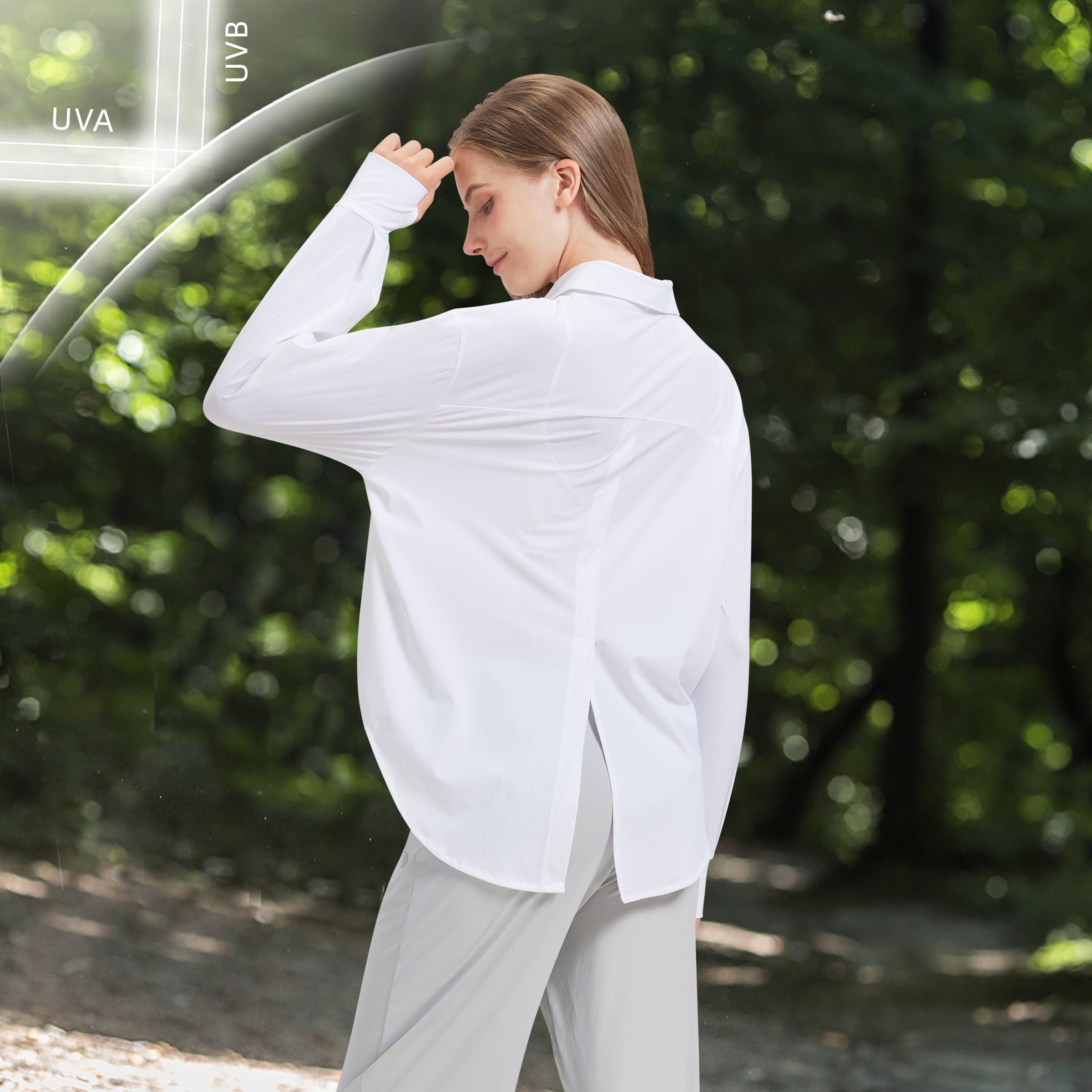 Summer sunshine, though pleasant, harbors a hidden threat that causes skin tanning and aging – ultraviolet (UV) rays. Whether it's the refreshing breeze of a morning run, the exhilaration of a bike ride, the comfort of a vacation, or your daily commute, you need a garment that combines robust sun protection with comfort and style. This Women's Slim Fit Slit UV Protection Shirt arrives with newly upgraded cooling technology, maximizing sun protection while maintaining elegance in everyday wear, making it an indispensable "sun protection champion" in your summer wardrobe.