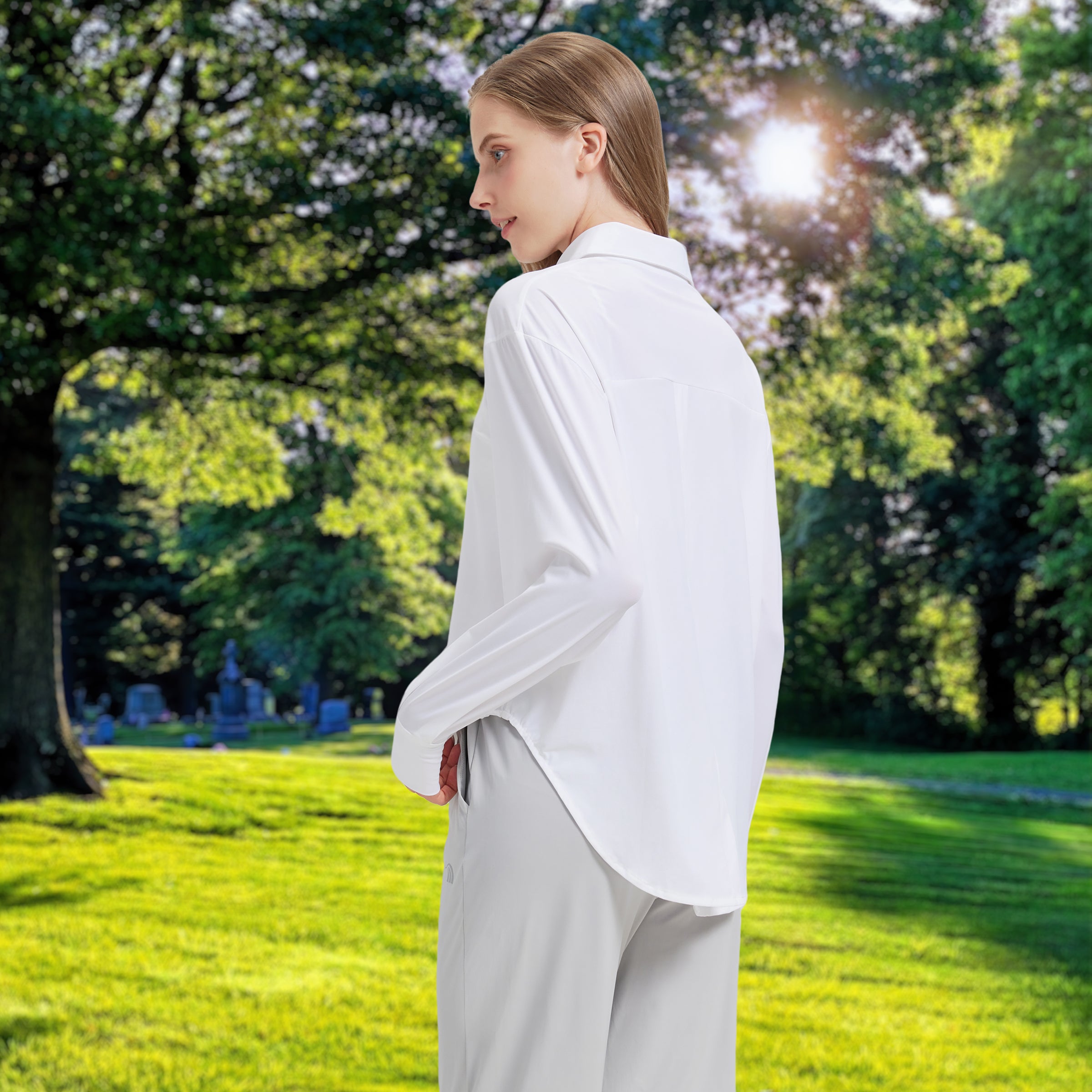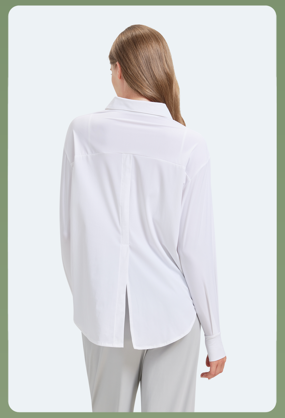 • Loose Fit: A relaxed silhouette provides effortless comfort without compromising on sleek, modern appeal. Thoughtfully designed with a longer hem, the shirt offers extra coverage at the back for added confidence.