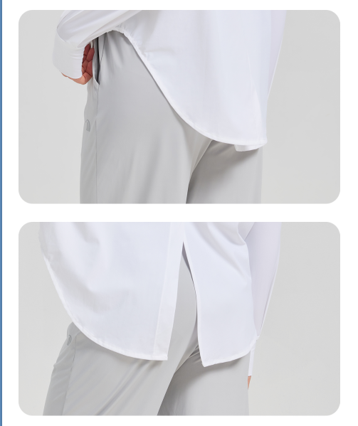 The core of sun protection lies in "effective blocking." This shirt has passed professional sun protection testing, achieving a UPF50+ sun protection index and a UV blocking rate of ≥97%, meaning it blocks the vast majority of harmful ultraviolet rays (UVA + UVB), allowing you to move freely in the sun without worrying about sunburn, sun damage, or even photoaging. The thumb loop design thoughtfully extends the cuff length, allowing you to easily slip your thumb in, ensuring full coverage of the back of your hand and avoiding the embarrassment of "white face, dark hands"—a truly comprehensive sun protection detail. This hip-covering design, with its perfect length, easily covers the hips and waist area, preventing sunburn on the waist and hips during prolonged sitting or activity, ensuring comprehensive sun protection.